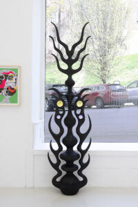 Emelie Sandström, Två Solar [Two Suns], 2025 (Spruce, linseed oil paint, epoxy, 200 x 50 x 24 cm).