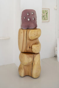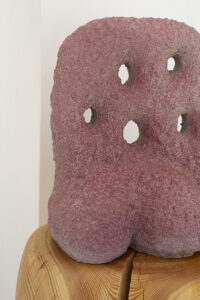 Sigve Knutson, Shotcrete Ceramics Small Dark Pink No. 2 (detail), 2024 (Stoneware, glaze, 38 x 33 x 22 cm) and Pine Trunk Stool No. 6 (detail), 2024 (Pine, 47 x 45 x 43 cm).